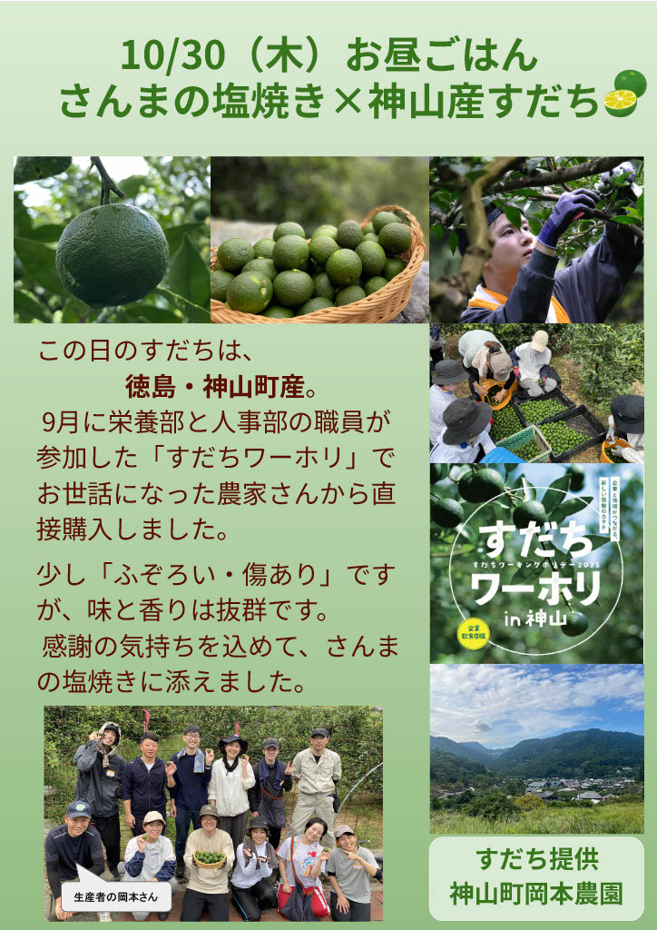2025年10月30日(木)、当院の昼食では、徳島県・神山町産のすだちを添えた「さんまの塩焼き」を提供いたします。