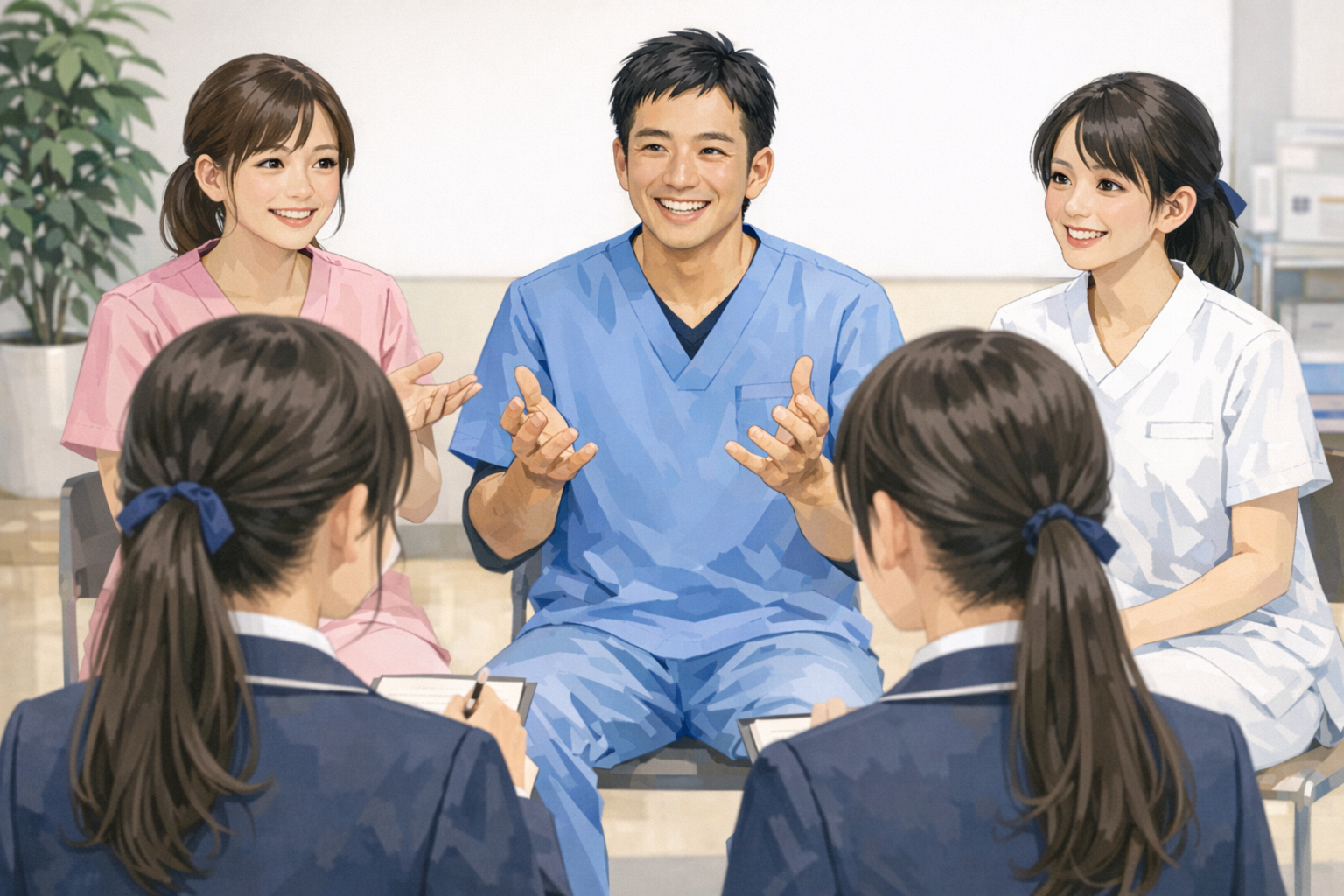 「看護師を目指したきっかけは?」「印象に残っている患者様とのエピソードは?」といった内容から、